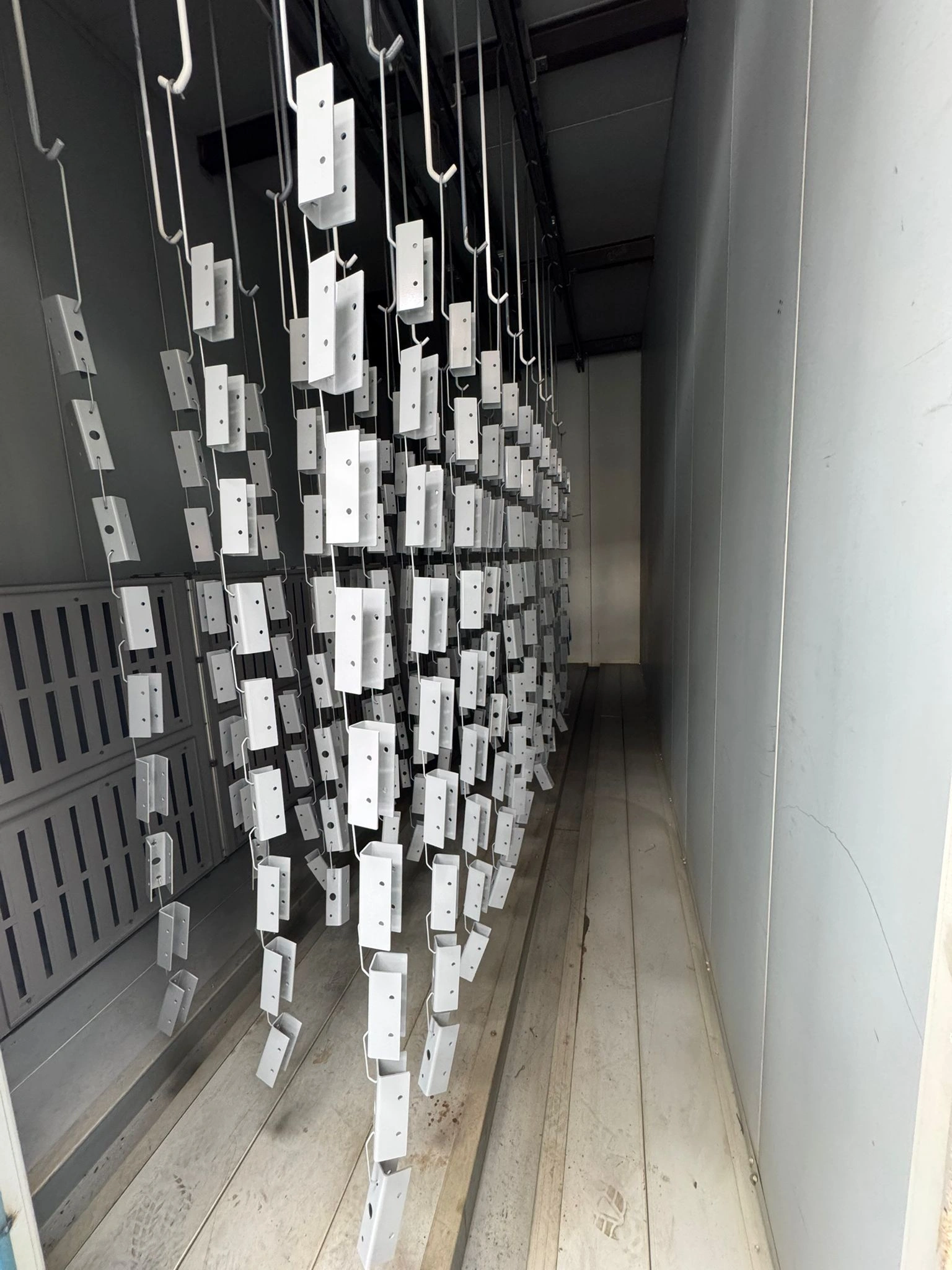 Deze afwerkingsstukjes hangen in de oven om de poedercoating te laten uitharden. Door het verhitten smelt het poeder en vormt het een duurzame, egale en beschermende laag. Dit proces zorgt ervoor dat de coating bestand is tegen slijtage, weersinvloeden en krassen, waardoor de kwaliteit en uitstraling van het eindproduct gewaarborgd blijft.