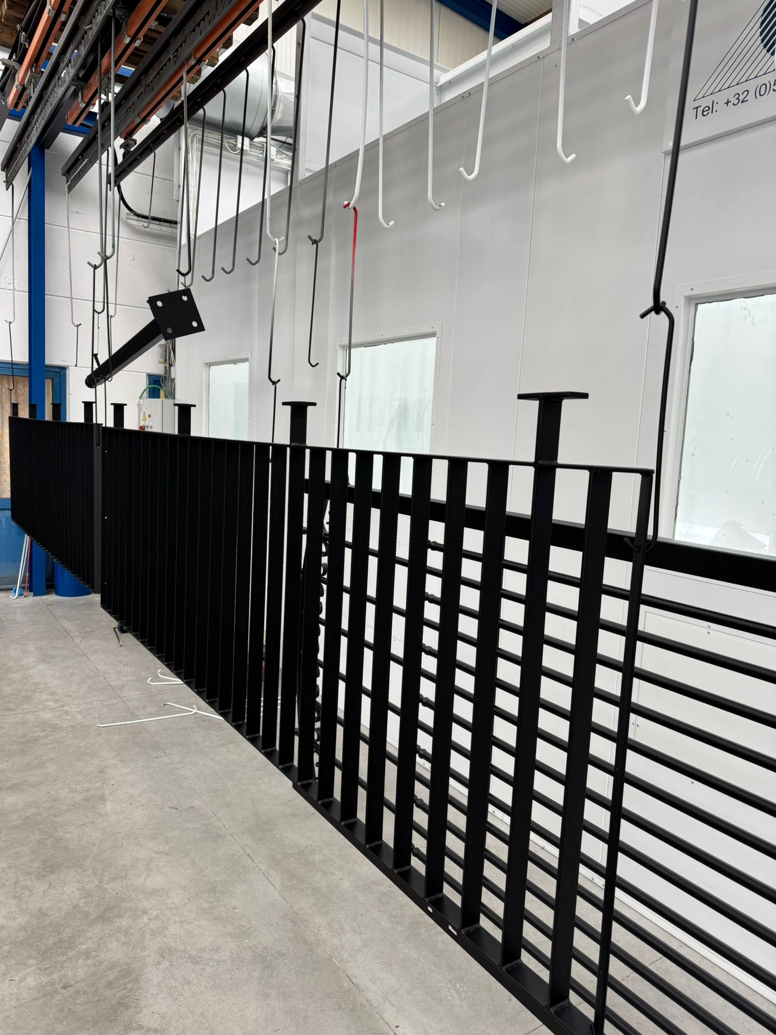 Deze zwarte balustrade hangt te koelen na het uitbakken van de poedercoating. Tijdens het uithardingsproces in de oven heeft de coating zich volledig gehecht, wat zorgt voor een duurzame, krasbestendige en esthetisch strakke afwerking. Het afkoelen is een cruciale stap om de kwaliteit en sterkte van de coating te waarborgen.