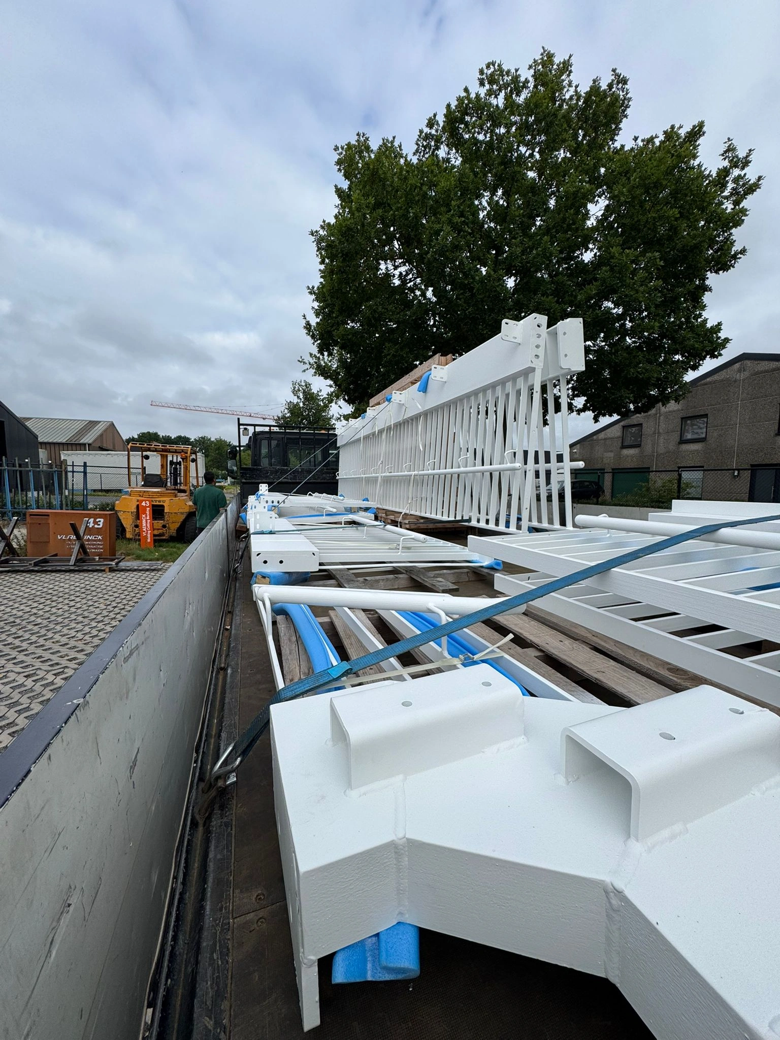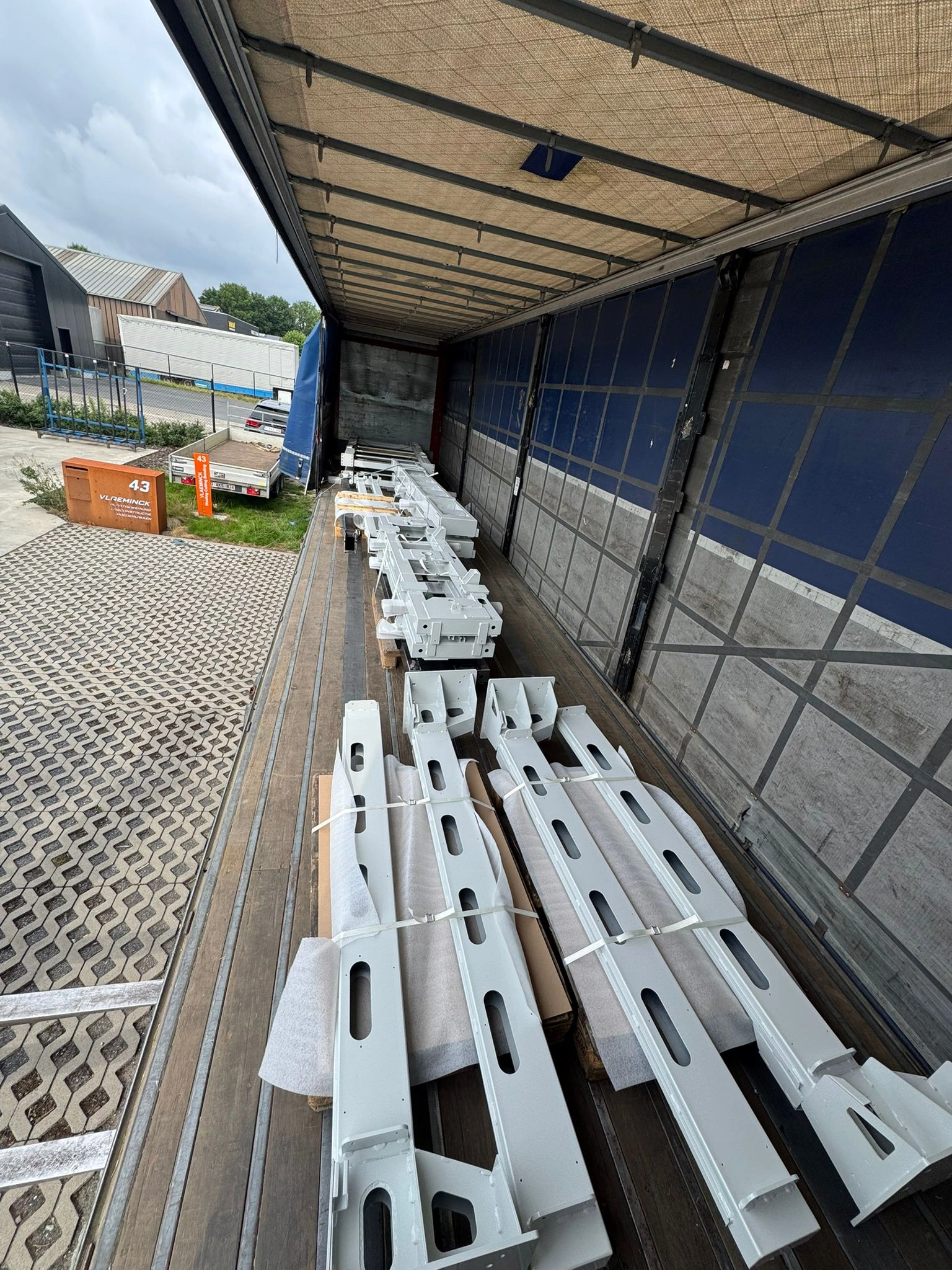 De afgewerkte onderdelen van het bordes liggen netjes op de camion, klaar om veilig naar de locatie vervoerd te worden. Dankzij de duurzame poedercoating zijn deze onderdelen beschermd tegen weersinvloeden en slijtage, zodat ze in optimale staat aankomen voor montage.
