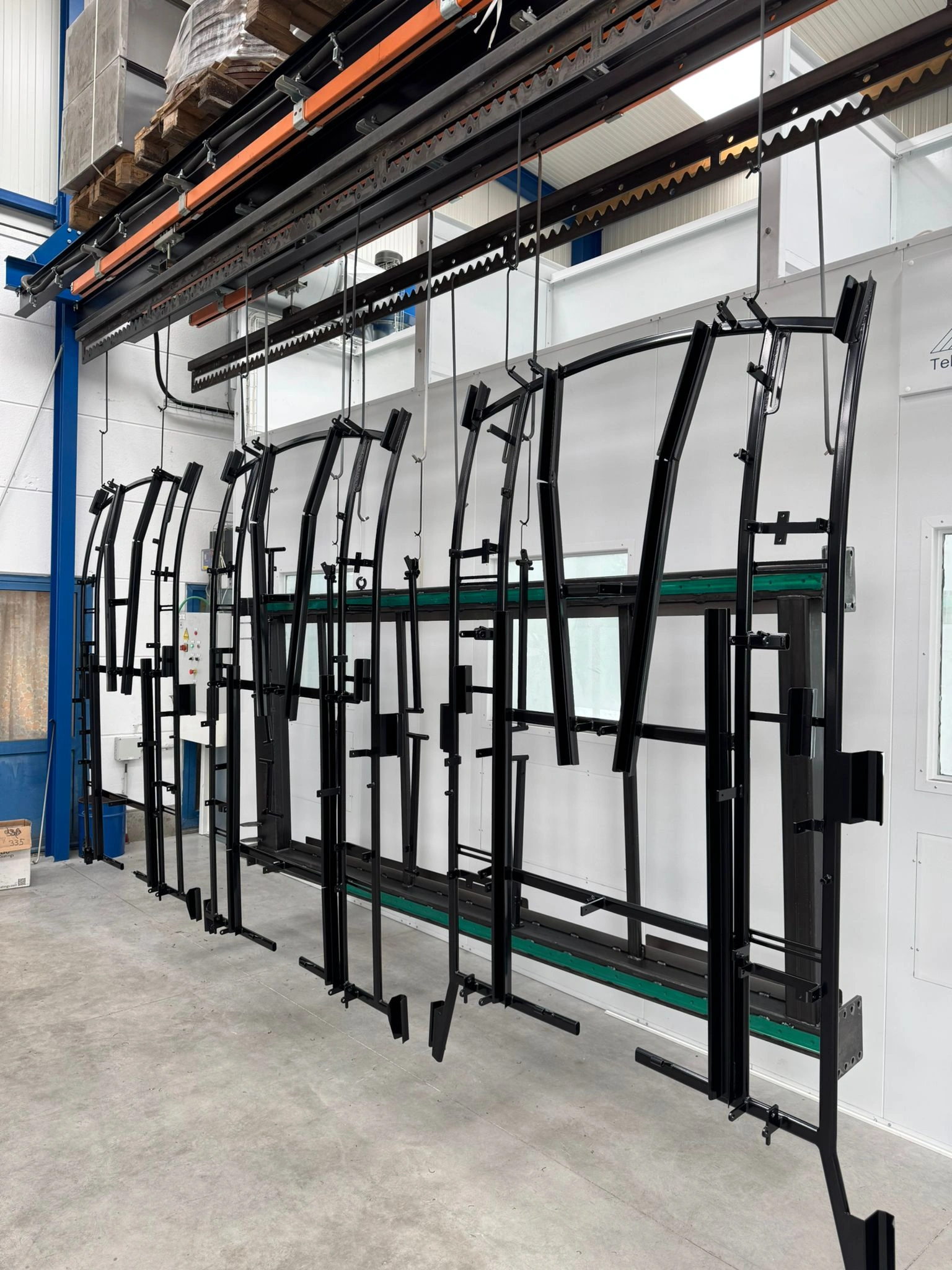 Deze fietsdragers, speciaal ontworpen voor bevestiging op het dak van een auto tijdens koersevenementen, hangen te koelen nadat ze zijn voorzien van een duurzame poedercoating. De afwerking zorgt voor optimale bescherming tegen slijtage en weersinvloeden tijdens intensief gebruik.