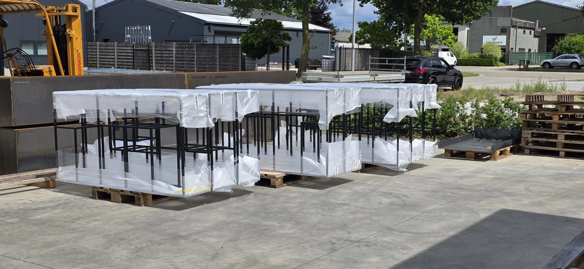 Deze gepoederlakte bordesonderdelen staan netjes op een bok, gereed om veilig verpakt en vervoerd te worden naar de bouwlocatie. Dankzij de duurzame poedercoating zijn de onderdelen beschermd tegen weersinvloeden en beschadigingen tijdens het transport.