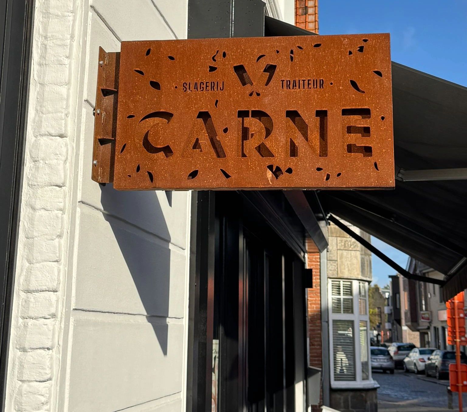 Een karaktervol gevelbord in cortenstaal dat de ambachtelijke uitstraling van de slagerij versterkt. De warme roestkleur en het strakke ontwerp zorgen voor een opvallende en duurzame blikvanger aan de gevel.