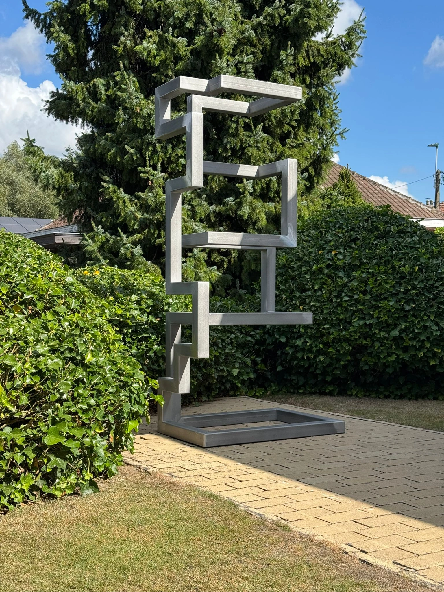 Dit kustwerk, opgebouwd uit robuuste vierkante kokers van cortenstaal, staat prachtig in een privé tuin. Het cortenstaal zorgt voor een natuurlijke, warme roestkleur die na verloop van tijd steeds karakteristieker wordt en perfect past in een buitenomgeving.