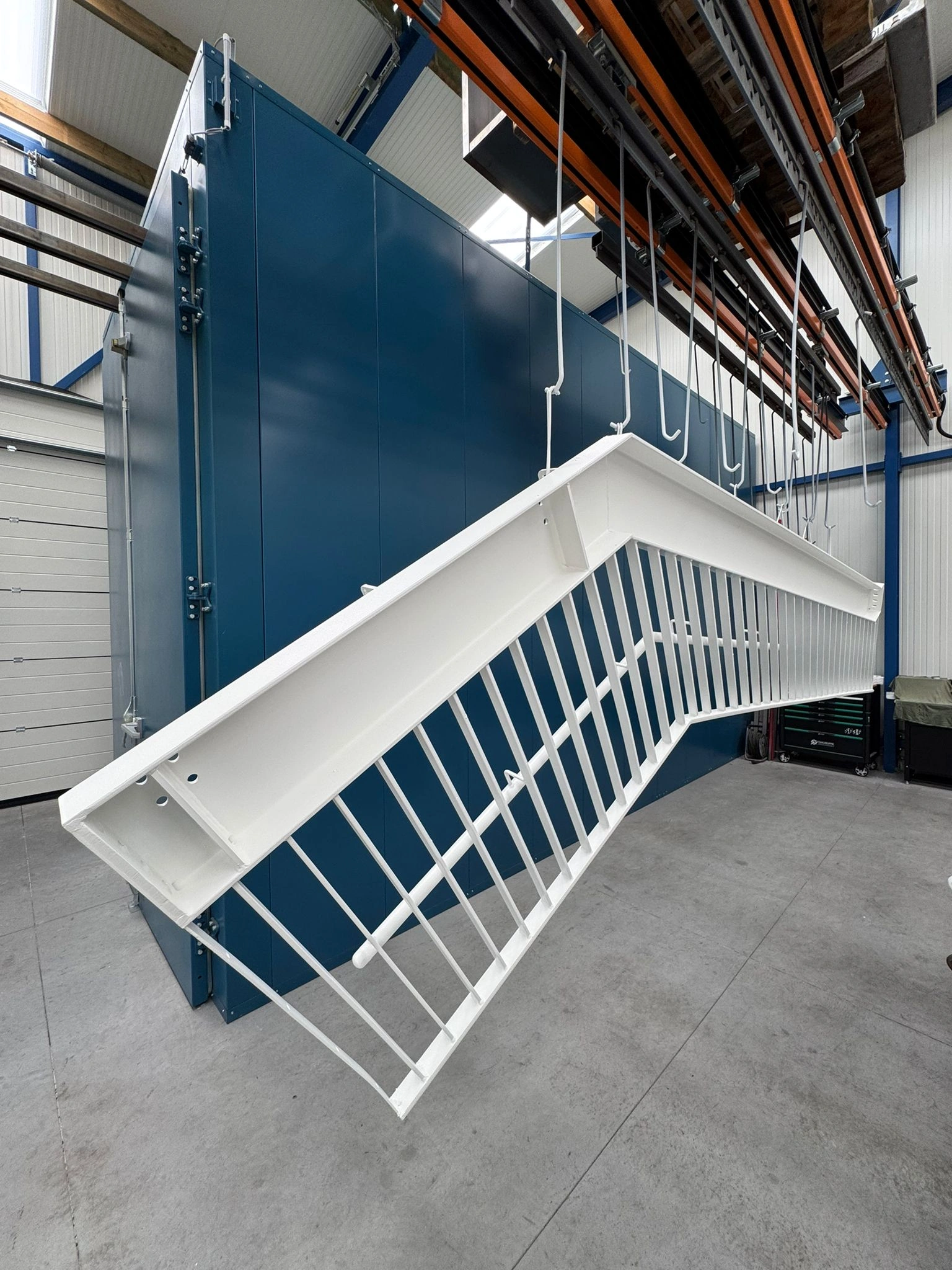 Deze trapleuning van een bordes hangt te koelen nadat de poedercoating in de oven is uitgehard. Het gecontroleerde afkoelproces zorgt ervoor dat de coating zijn maximale duurzaamheid en krasbestendigheid bereikt, essentieel voor de veiligheid en uitstraling van het bordes.