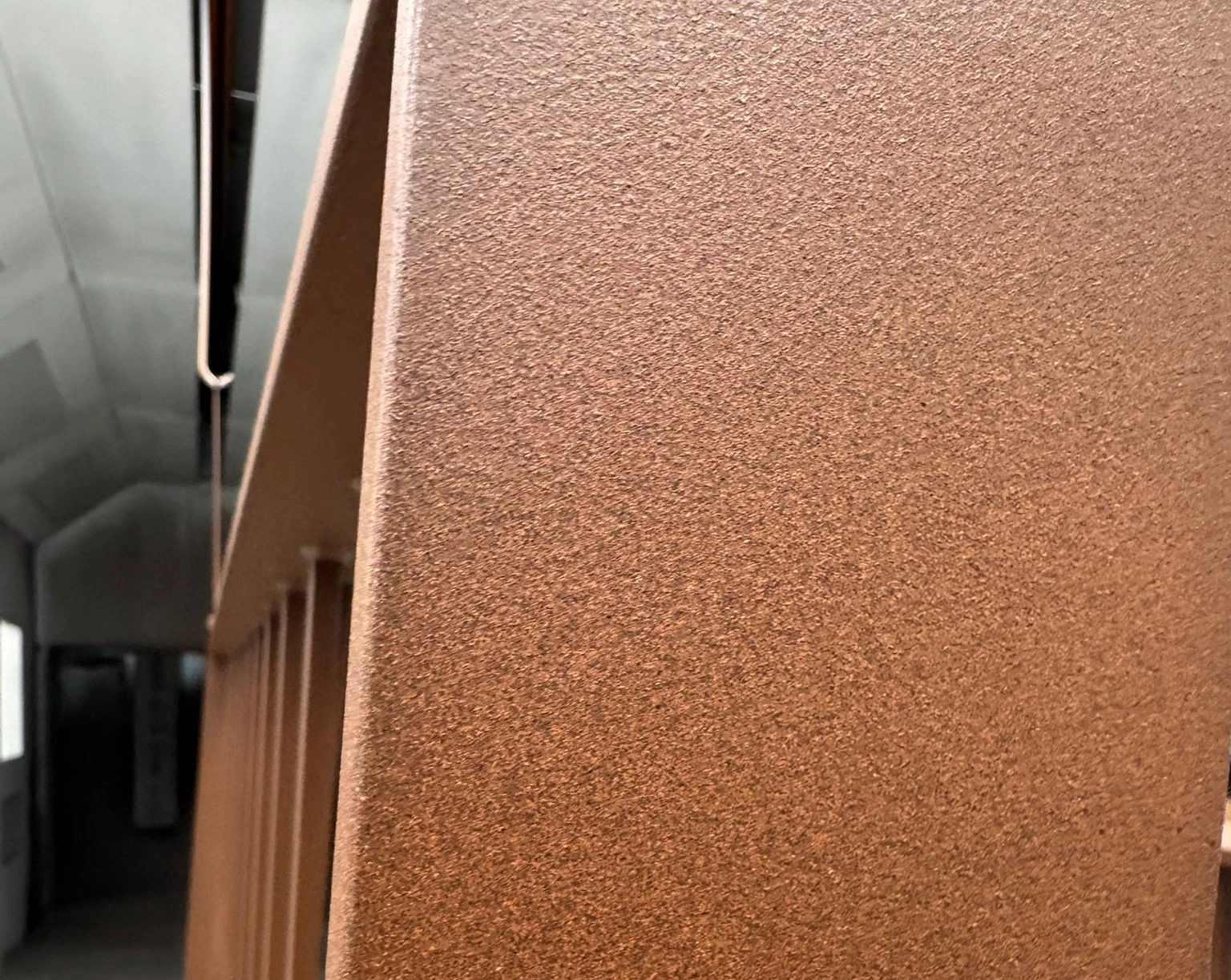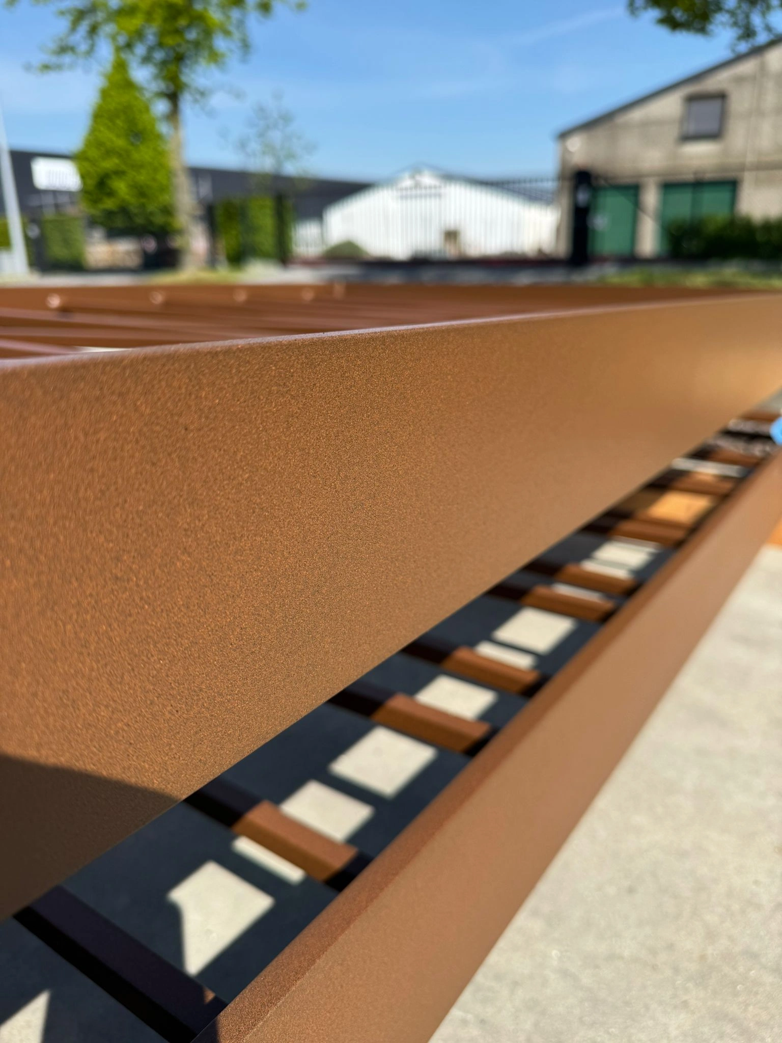 Deze close-up toont het gedetailleerde oppervlak van een poedergecoate afwerking met cortenstaal-look. De coating imiteert de warme, roestige uitstraling van echt cortenstaal, maar biedt de voordelen van een duurzame, onderhoudsarme en krasbestendige afwerking.
