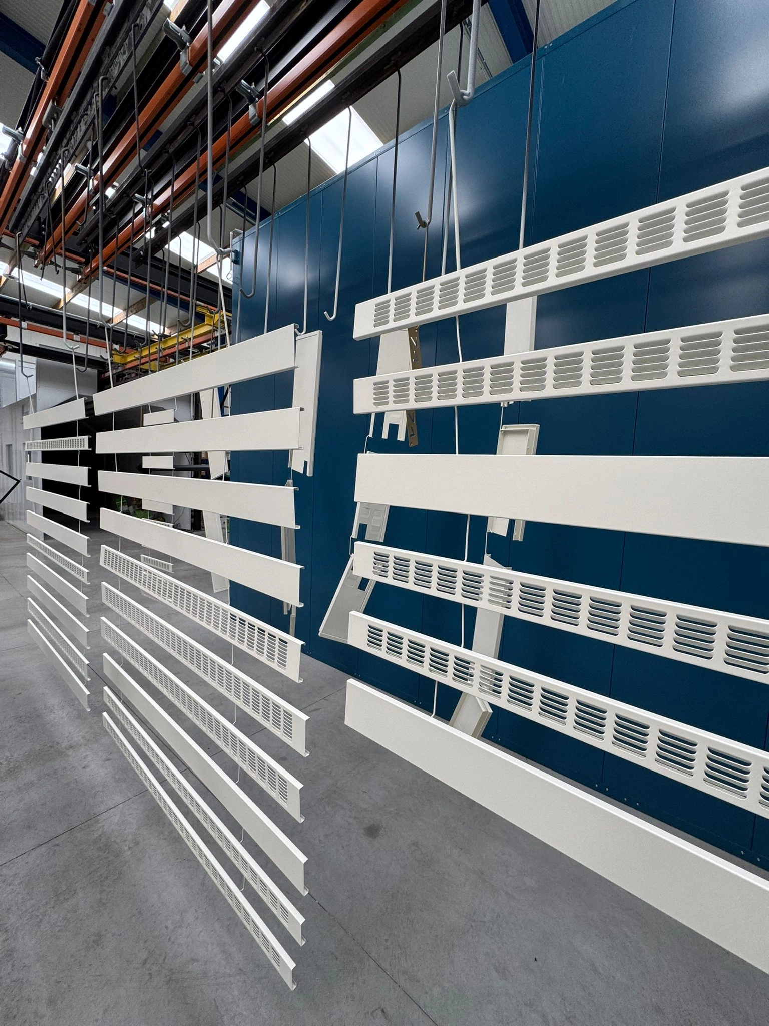Deze radiatoronderdelen hangen te koelen na het uitbakken van de poedercoating. Door het gecontroleerde koelproces hardt de coating uit, waardoor een duurzame, krasbestendige en gelijkmatige beschermlaag ontstaat die de onderdelen optimaal beschermt tegen slijtage en corrosie.
